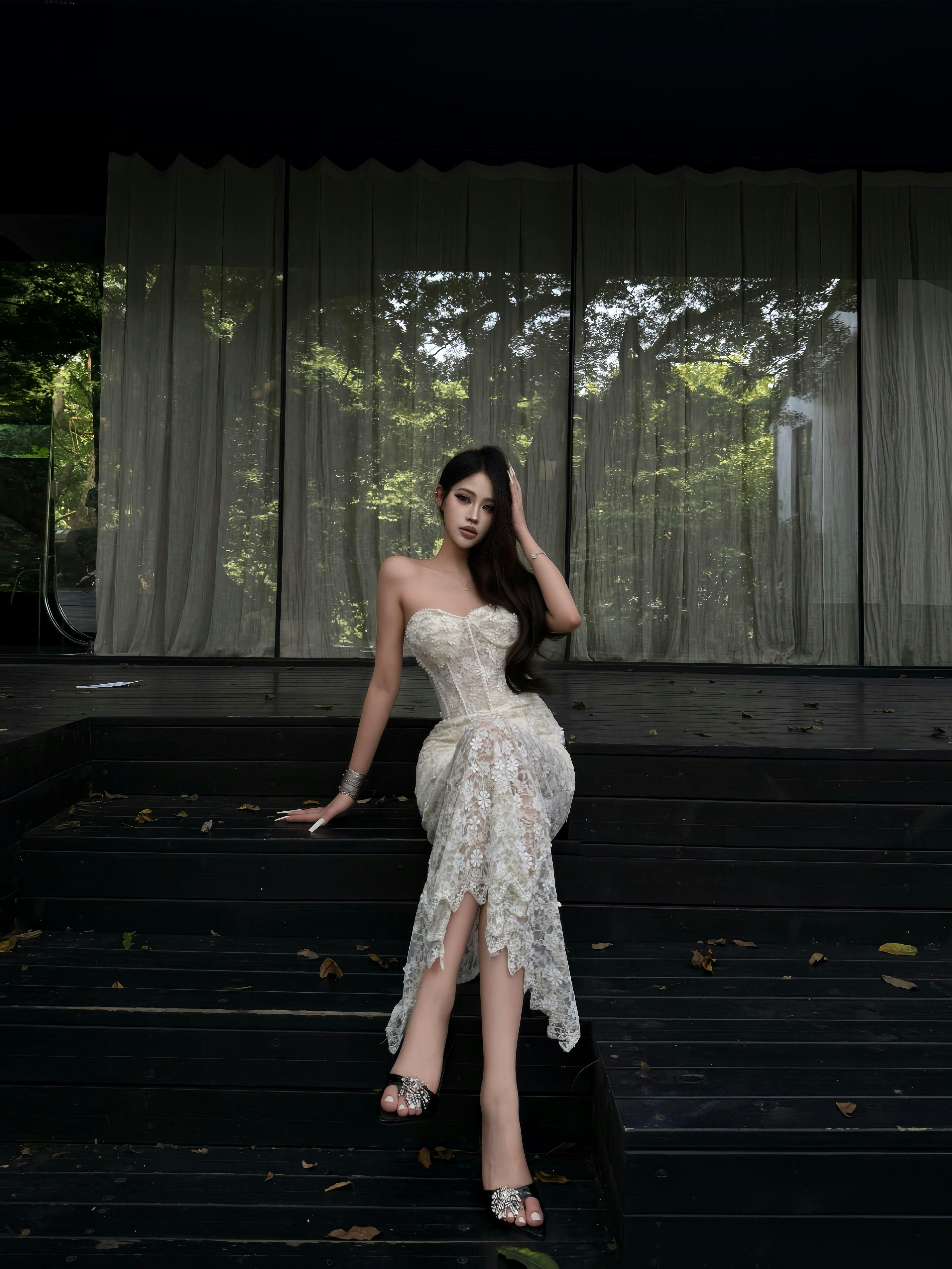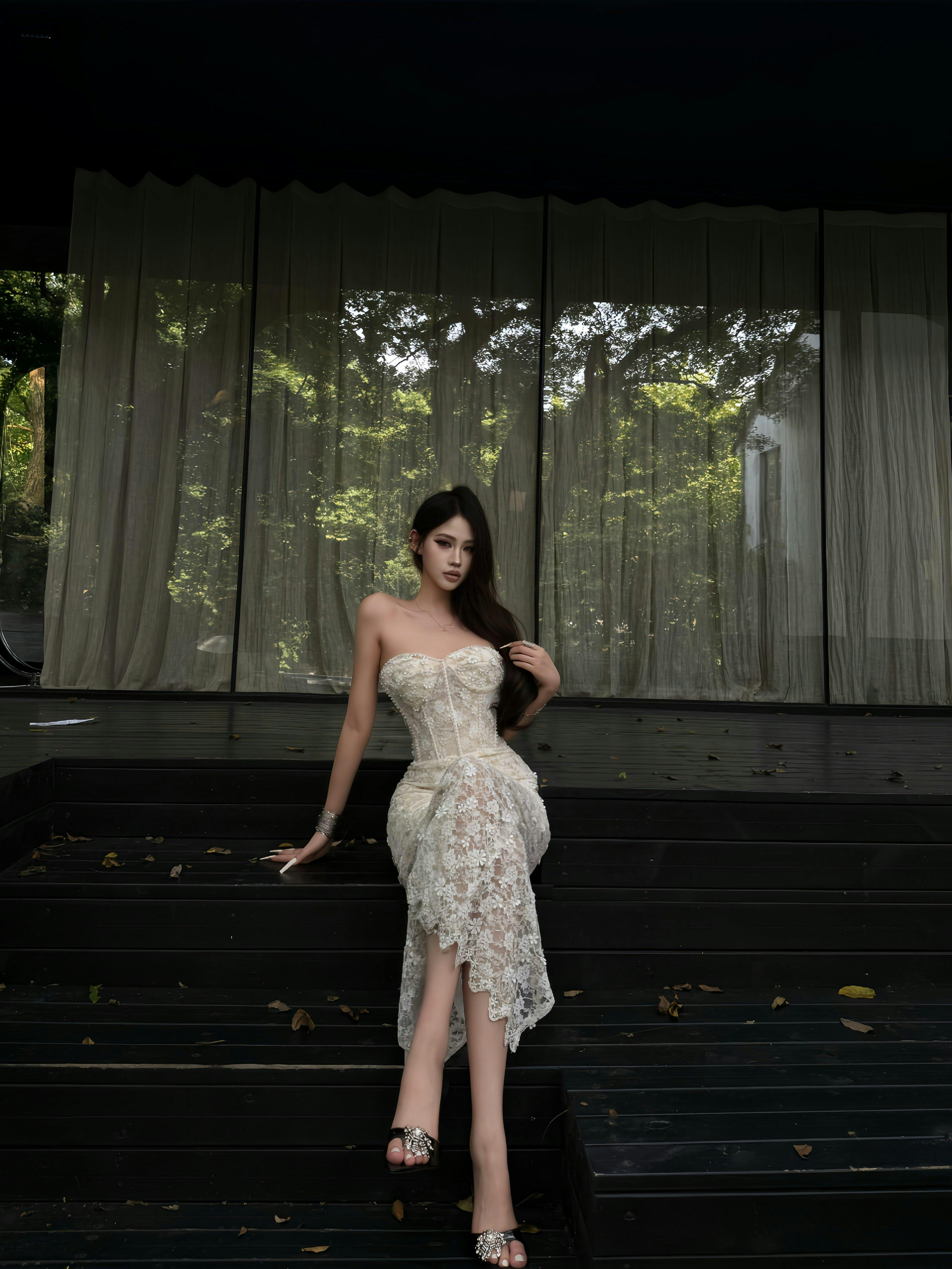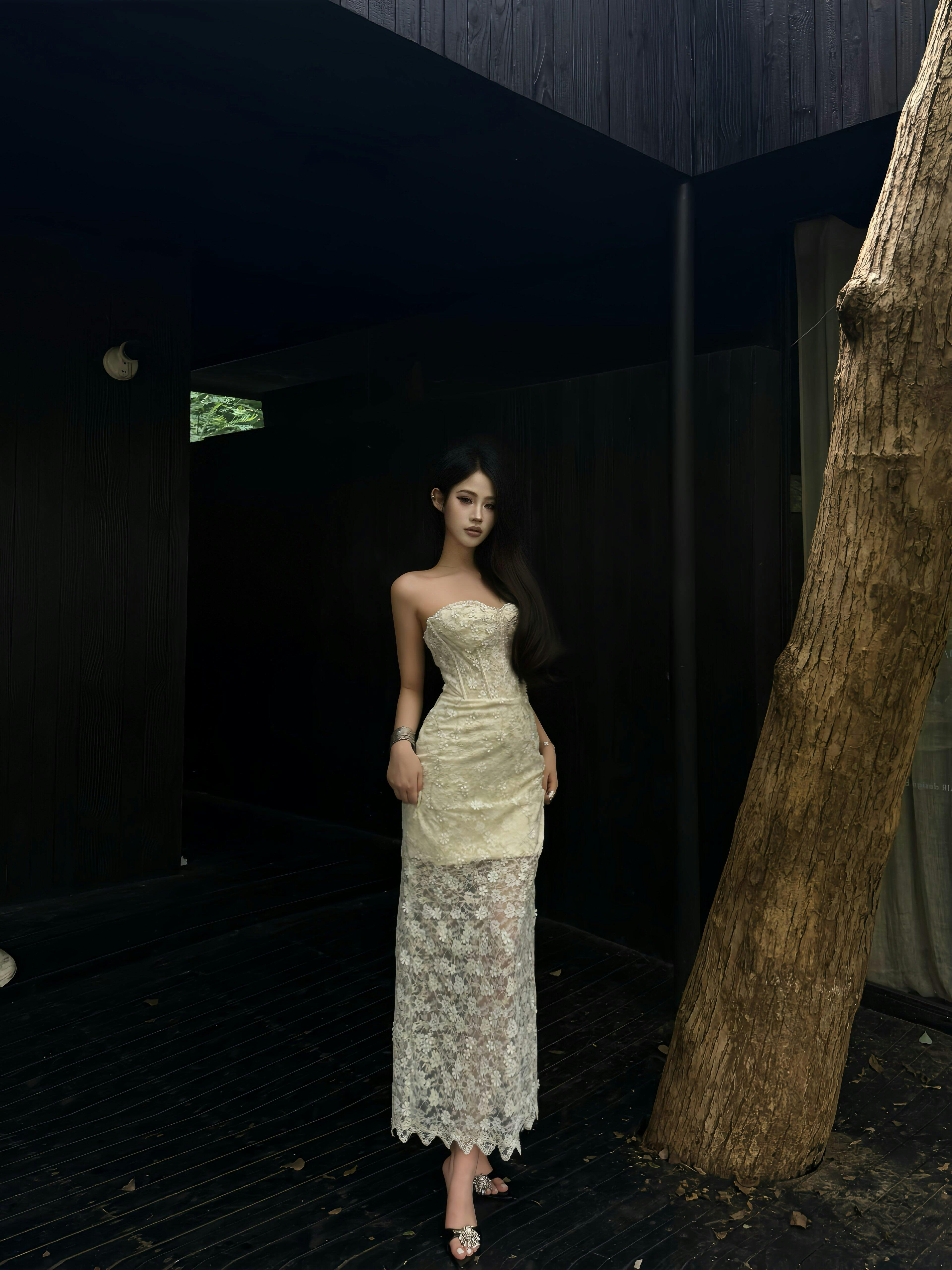 Exude timeless elegance in this stunning strapless lace gown, adorned with intricate beadwork and delicate embroidery throughout. The luxurious lace fabric drapes gracefully while the elaborate embellishments create a captivating focal point, perfect for formal occasions, galas, and unforgettable celebrations. The strapless silhouette offers a refined, sophisticated look that commands attention. Crafted with meticulous attention to detail, this dress combines classic beauty with contemporary glamour, ensuring you'll feel confident and radiant.