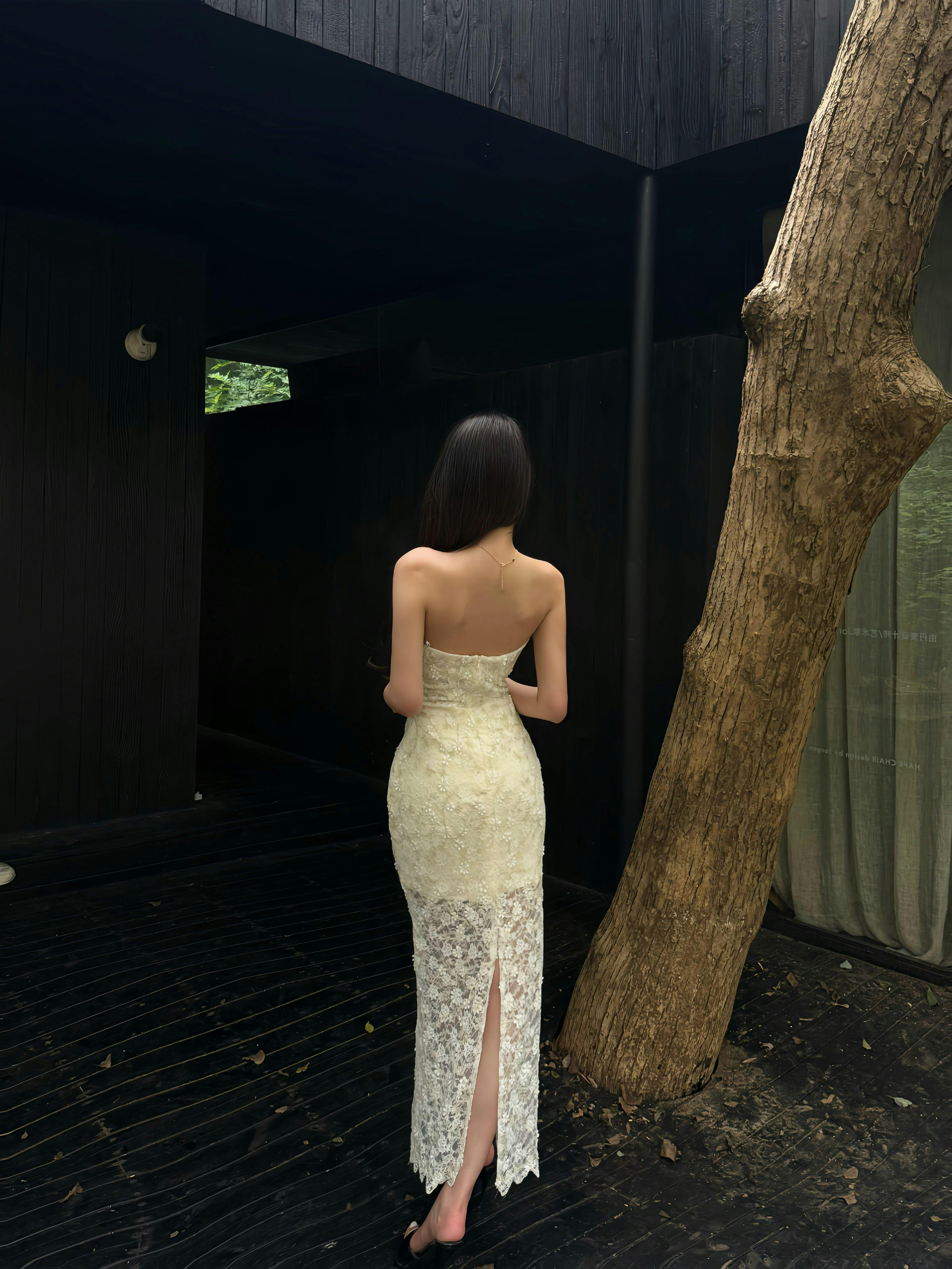 Heavily Beaded and Embroidered Strapless Lace Dress Y115